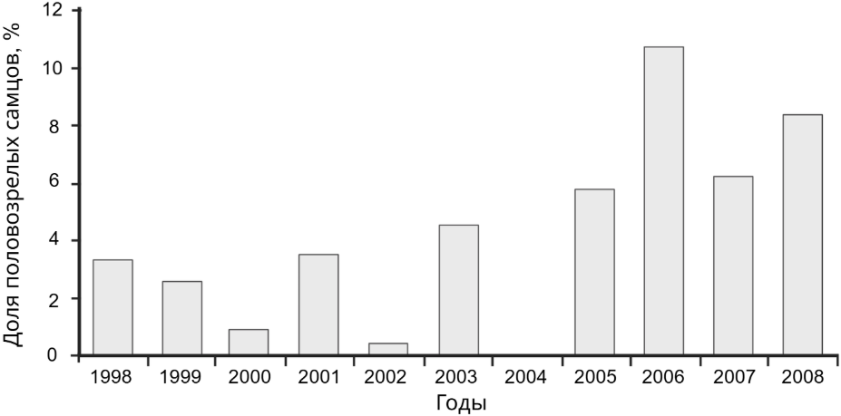 Проанализируйте диаграмму "Доля половозрелых самцов в популяциях сайгака Северо-Западного Прикаспия в 1998-2008 гг.". Выберите утверждения, которые можно сформулировать на основании анализа представленных данных. Запишите в ответе цифры, под которыми указаны выбранные утверждения.