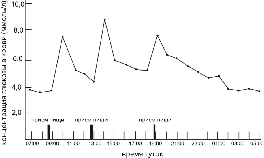 4) Глюкоза поступает в кровь через некоторое время после приема пищи.