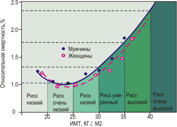 4) При индексе массы тела 25 и выше уровень смертности растет пропорционально индексу массы тела.