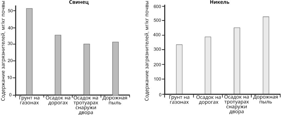 Проанализируйте диаграммы, иллюстрирующие степень загрязнения окружающей среды свинцом и никелем. Выберите все утверждения, которые можно сформулировать на основании анализа представленных данных. Запишите в ответе цифры, под которыми указаны выбранные утверждения.