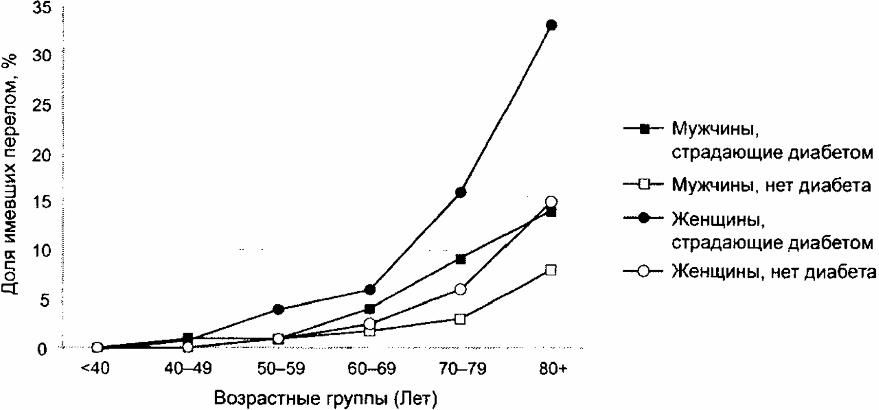 2) Среди страдающих диабетом у мужчин перелом шейки бедра случается реже, чем у женщин.