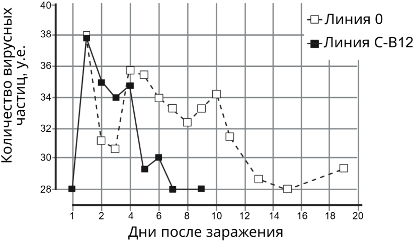 3) У птиц линии С-В12 после первого контакта с птицами линии 0 количество вирусных частиц уменьшается, а затем увеличивается.