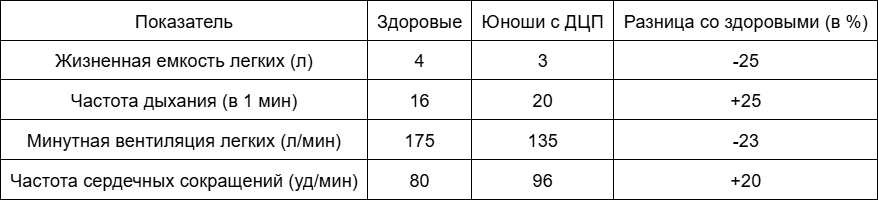 3) Частота дыхания у юношей с ДЦП на 25% ниже, чему здоровых юношей.