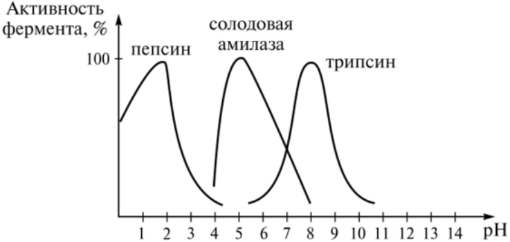 Проанализируйте график зависимости активности фермента от значения pH среды (по оси х отложено значение pH среды, а по оси у скорость ферментативной реакции). Выберите все утверждения, которые можно сформулировать на основании анализа представленных данных. Запишите в ответе цифры, под которыми указаны выбранные утверждения.